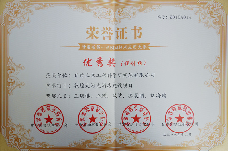 由甘肅省建筑業(yè)聯(lián)合會、甘肅省勘察設(shè)計協(xié)會、甘肅省建設(shè)監(jiān)理協(xié)會、甘肅省建筑職教集團(tuán)主辦的甘肅省第一屆BIM技術(shù)應(yīng)用大賽頒獎典禮于近日舉行,由我公司建筑設(shè)計中心王炳棋、汪麒、武潔、漆晨剛、劉海鵬幾位專業(yè)技術(shù)人員負(fù)責(zé)的“敦煌天和大酒店建設(shè)項目”BIM技術(shù)優(yōu)化設(shè)計獲得設(shè)計組優(yōu)秀獎。