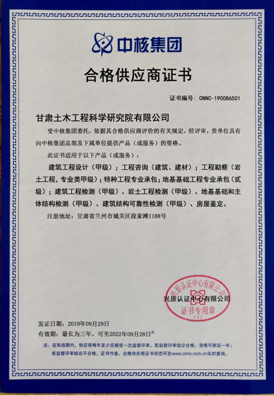 近日,公司成功通過中核集團興原認證中心有限公司和中核集團合格供應(yīng)商專家委員會及管理委員會審核認證,順利獲得建筑工程設(shè)計(甲級);工程咨詢(建筑、建材);工程勘察(巖土工程,專業(yè)類甲級);特種工程專業(yè)承包;地基基礎(chǔ)工程專業(yè)承包(貳級);建筑工程檢測(甲級)、巖土工程檢測(甲級)、地基基礎(chǔ)和主體結(jié)構(gòu)檢測(甲級)、建筑結(jié)構(gòu)可靠性檢測(甲級)、房屋鑒定的合格供應(yīng)商資格。