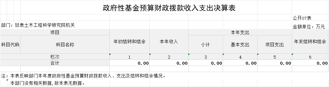 2023年度政府性基金預(yù)算財(cái)政撥款年初結(jié)轉(zhuǎn)和結(jié)余0.00萬元,本年收入0.00萬元,本年支出 0.00萬元,年末結(jié)轉(zhuǎn)和結(jié)余 0.00萬元,