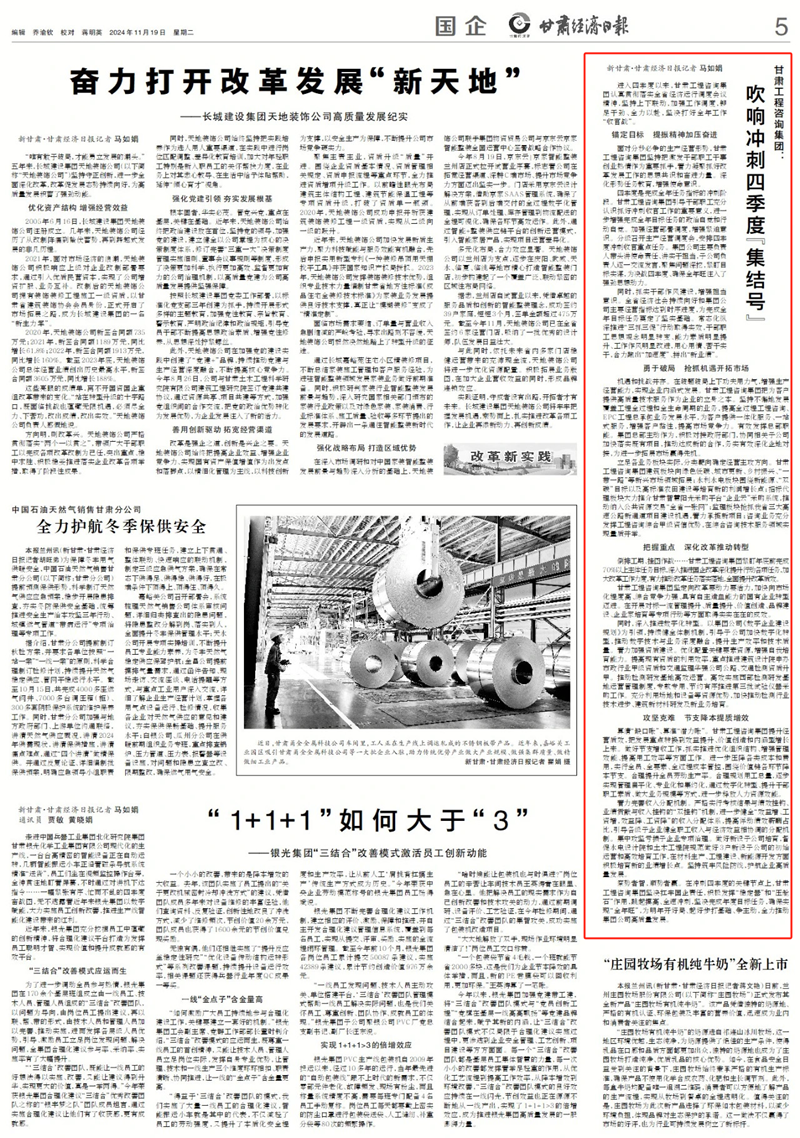 機(jī)遇和挑戰(zhàn)并存。在破題破局上下功夫用力氣,增強(qiáng)生產(chǎn)經(jīng)營(yíng)能力,實(shí)現(xiàn)企業(yè)內(nèi)涵式發(fā)展。甘肅工程咨詢(xún)集團(tuán)把為客戶(hù)提供高質(zhì)量技術(shù)服務(wù)作為企業(yè)的立身之本。堅(jiān)持不懈地發(fā)展覆蓋工程全過(guò)程和全生命周期的業(yè)務(wù),提高全過(guò)程工程咨詢(xún)、EPC工程總承包業(yè)務(wù)發(fā)展水平,為客戶(hù)提供一體化服務(wù)、一站式服務(wù),增強(qiáng)客戶(hù)黏性,提高市場(chǎng)競(jìng)爭(zhēng)力。有效發(fā)揮總部職能。集團(tuán)總部主動(dòng)作為,積極對(duì)接政府部門(mén),協(xié)同相關(guān)子公司加快落實(shí)既有項(xiàng)目,推動(dòng)達(dá)成新的合作,務(wù)實(shí)有效深化企地對(duì)接,為進(jìn)一步拓展市場(chǎng)贏得先機(jī)。