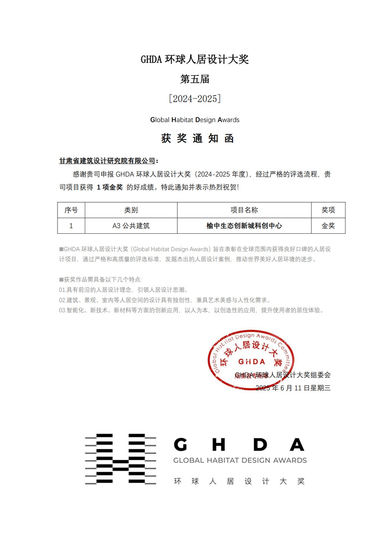 近日,備受矚目的第五屆GHDA環(huán)球人居設(shè)計(jì)大獎(jiǎng)獲獎(jiǎng)名單揭曉。甘肅工程咨詢集團(tuán)旗下省建筑設(shè)計(jì)院精心打造的榆中生態(tài)創(chuàng)新城科創(chuàng)中心項(xiàng)目,繼榮獲美國綠色建筑委員會頒發(fā)的LEED V4 BD+C鉑金級預(yù)認(rèn)證、中國綠色建筑三星級預(yù)評價(jià)兩項(xiàng)權(quán)威認(rèn)證后,再度摘得公共建筑類金獎(jiǎng),彰顯出我省在人居設(shè)計(jì)領(lǐng)域的卓越實(shí)力。