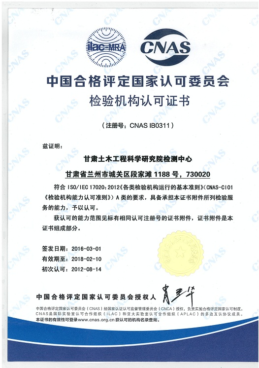 2012年2月首次依據(jù)CNAS-CL01建立了檢驗機構(gòu)質(zhì)量管理體系,2012年8月初次通過國家檢驗機構(gòu)認(rèn)可,檢驗領(lǐng)域為建筑地基(地基、樁基承載力試驗與評價)、建筑結(jié)構(gòu)(工程施工質(zhì)量評價、結(jié)構(gòu)設(shè)計復(fù)核、結(jié)構(gòu)抗震性能評價、結(jié)構(gòu)安全性與可靠性評價)、建筑節(jié)能(圍護結(jié)構(gòu)節(jié)能性能施工質(zhì)量及評價、建筑物能耗及節(jié)能綜合指標(biāo)評價)、混凝土(混凝土配合比質(zhì)量評定、混凝土質(zhì)量和生產(chǎn)過程質(zhì)量控制評定)。歷經(jīng)監(jiān)督檢查,換證復(fù)評審,持續(xù)有效運行5年。